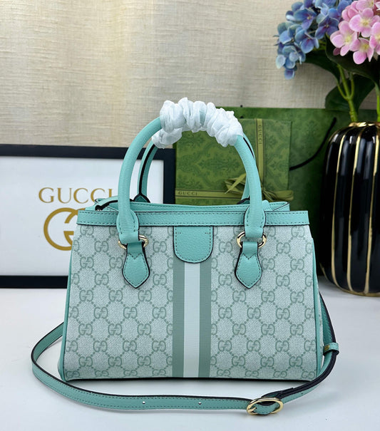 Gucci Light Blue/Mint GG Canvas Medium Tote Bag with Leather Trim